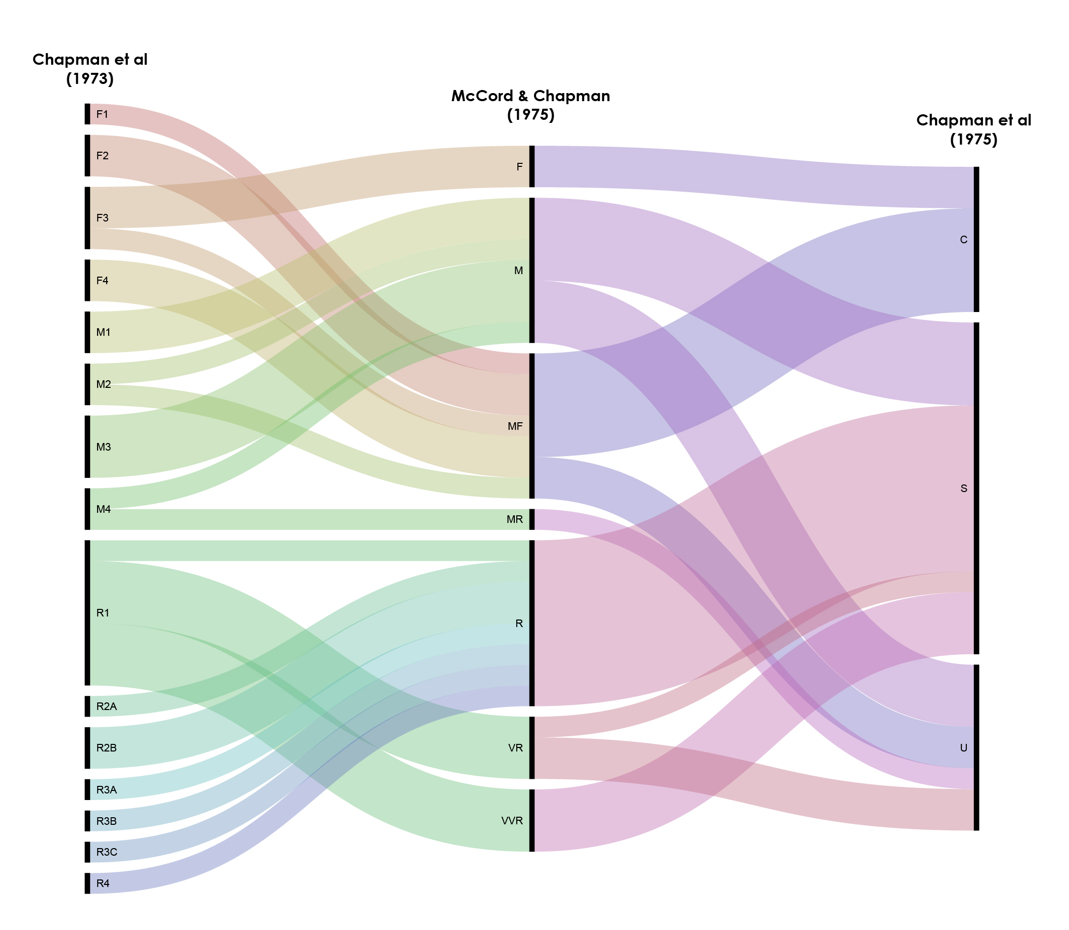 1. Classes Defined from 1973 to 2013 (as shown in ALluvial Diagram):