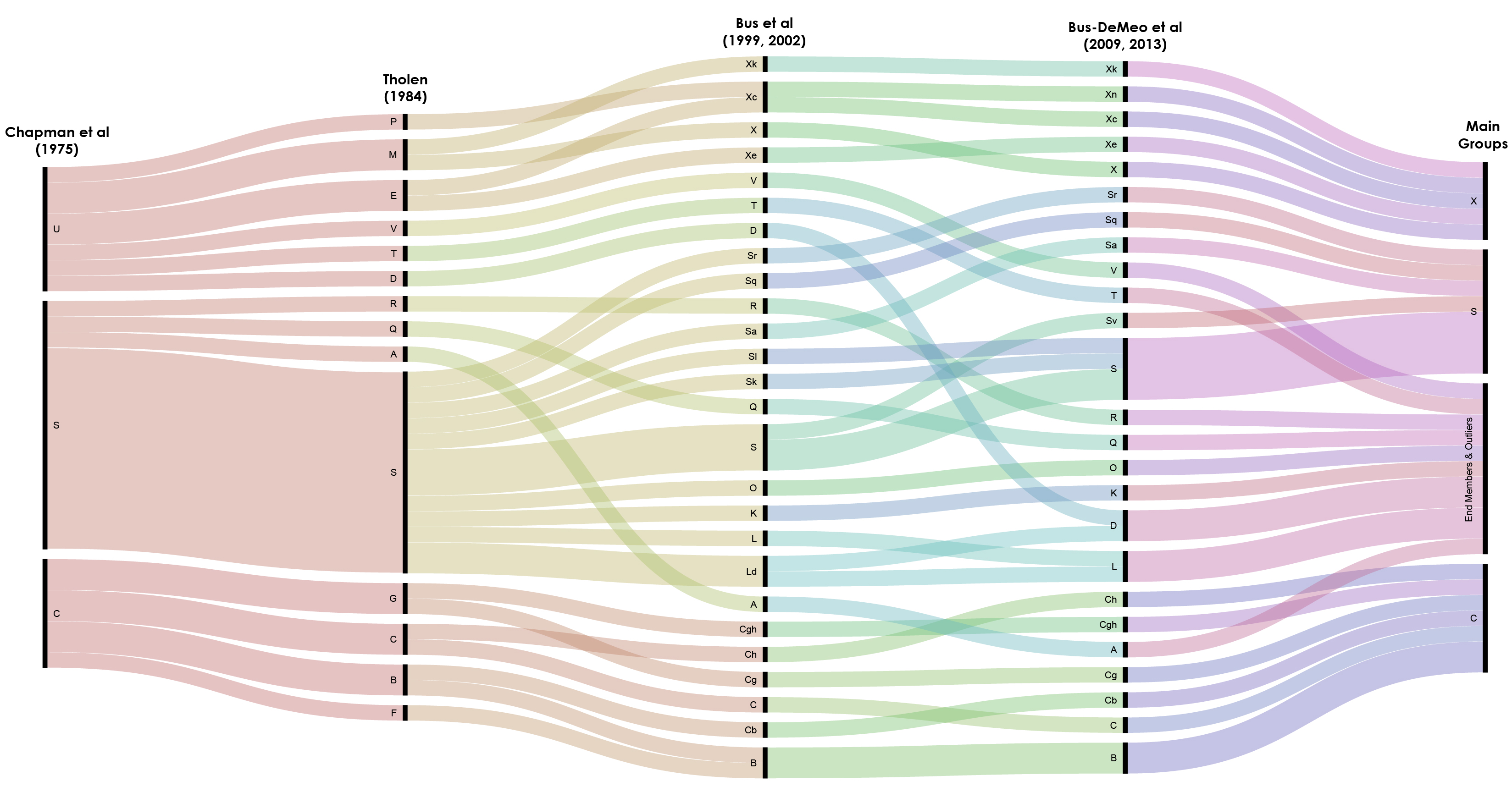 The following alluvial diagram attempts to show the evolution of the various asteroid classification systems that define the A to Z of asteroid spectral types quoted today (meaning in 2019).