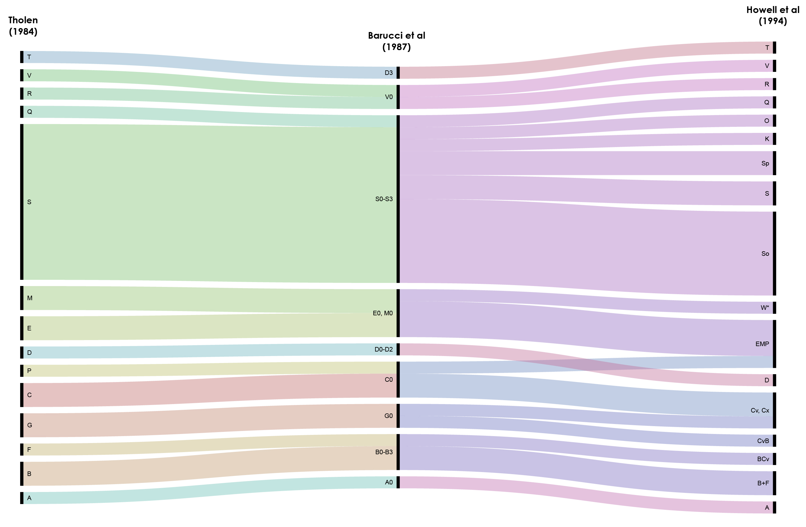 Barucci, M.A., Capria, M.T., Coradini, A. & Fulchignoni, M. (1987). Classification of asteroids using G-mode analysis. Icarus, 72(2), pp. 304-324. https://doi.org/10.1016/0019-1035(87)90177-1. There is an extension to this paper (not included in the alluvial diagram as the taxonomy is unchanged from the 1987 version) which can be found at Fulchignoni, M., Birlan, M., & Barucci, M.A. (2000). The extension of the G-mode asteroid taxonomy. Icarus, 146(1), pp. 204-212. https://doi.org/10.1006/icar.2000.6381