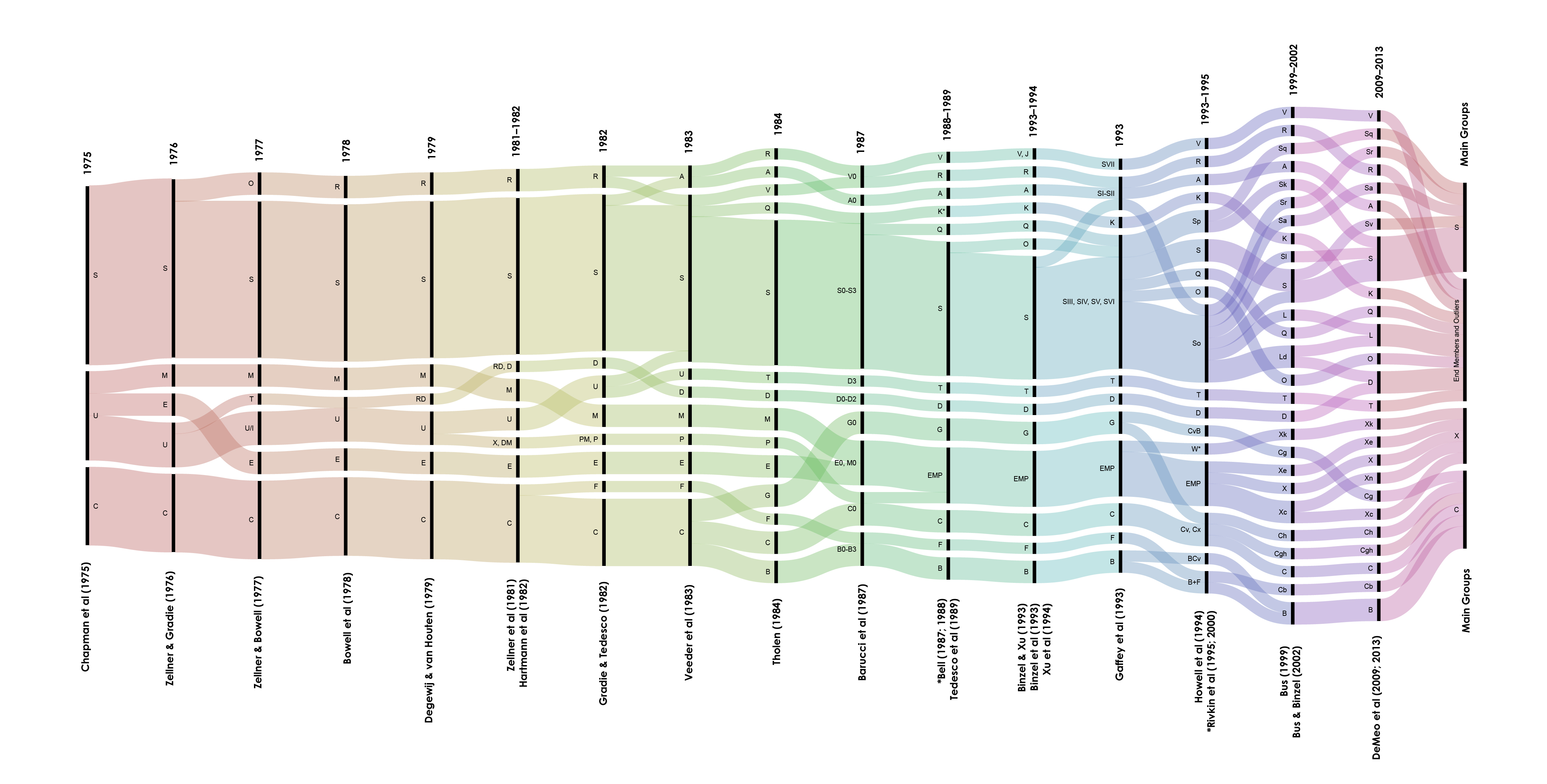1. Classes defined from 1973 to 2013 (as shown in alluvial diagram) (in date order)